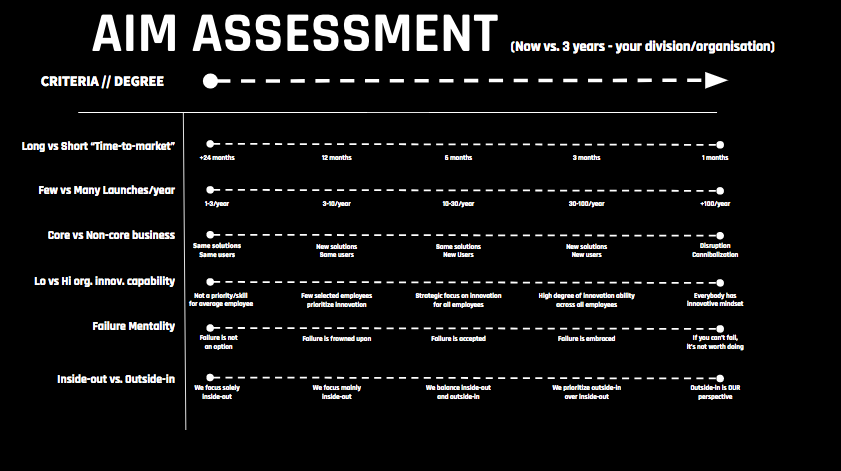 Determining how to design the innovation efforts in a large organisation would benefit greatly by assessing which agile innovation must-win-battles are important and to which degree you want to change them in the next 3 years.