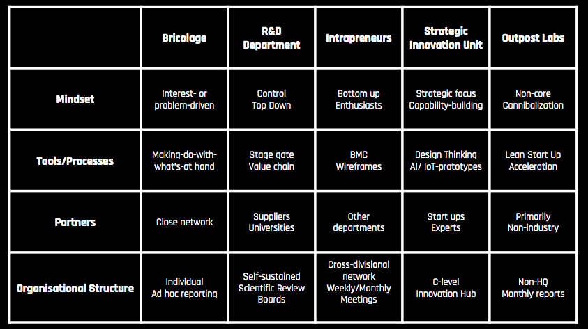 R&D Department-style innovation efforts perform basic research in core business domains to achieve long-term innovation advantages. Less focus on applications and business models.