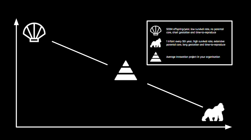 As with species in Nature, organisations need to adapt to changes in their environment, e.g. new technologies, business models, competitors, legislation etc. Some species of organisations are better at this than others. In the wake of the financial crisis, most organisations chose or were forced to lessen the type and amount of innovation projects in exchange for fewer low-risk but big-budget projects. The illustration below visualizes two very different reproduction or innovation strategies from Nature: