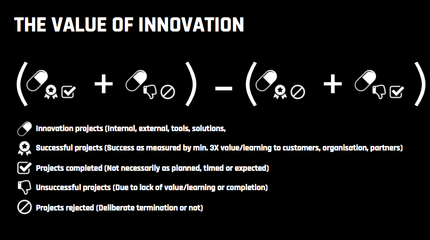 Innovation may require new technology by addressing new user groups in radically different-from-before ways, but at its core lies value creation. To measure value from innovation efforts in organisations, we should focus on the work we choose to undertake, as well as the projects we reject or abandon. Efforts can be further subdivided into two categories: successful and unsuccessful projects (as measured by value creation and/or learning to organisation). Below is an approximative equation describing how to measure the value of innovation: