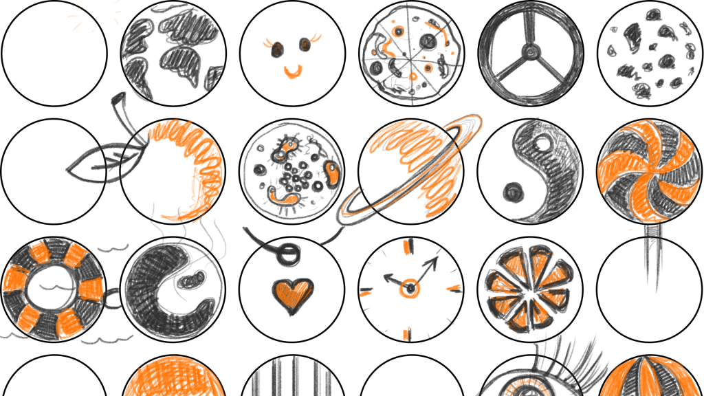 - Once the time has ended, discuss the outcome with the participants (we broke them in pairs). How many circles did you fill up? Are there any recognisable patterns or are any of the ideas related, fx. several planets or different sport balls. Was the task challenging? Did you or someone “break the rules” by combining circles or using them in an unexpected way?