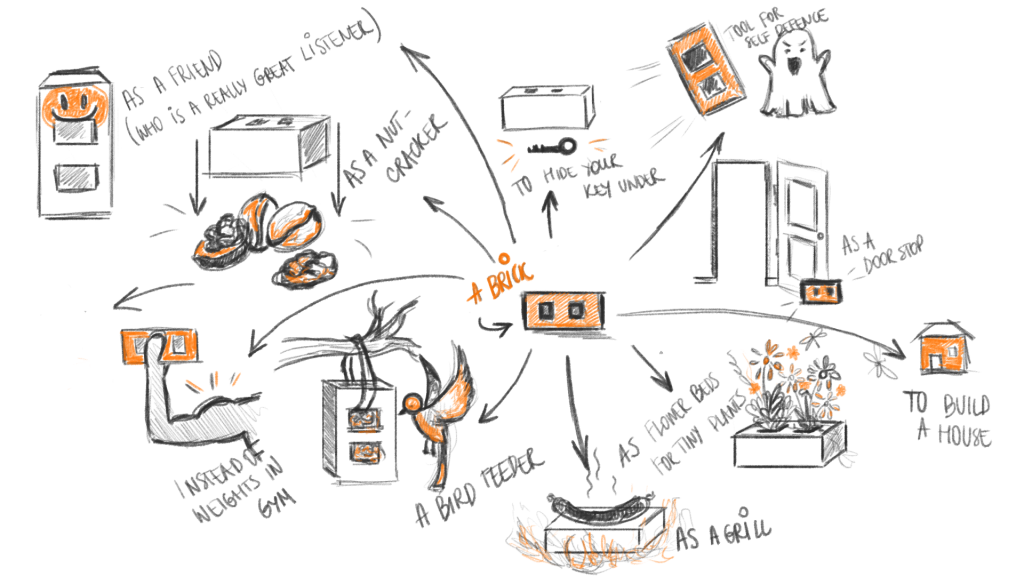 - In 3 minutes, note down as many ideas as possible of how else you can use an everyday object – during our workshop we chose a brick. Fx. if the normal use of the brick is to use it for building, then alternate uses could be: use it as a grill, for self defence or even color it as your buddy, just like a Wilson ball in Cast Away movie.