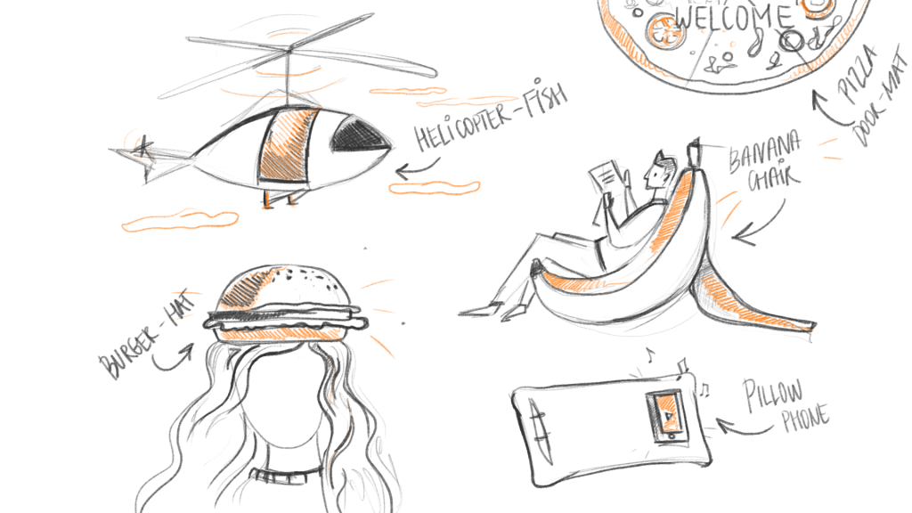 In this exercise you will need to connect two objects and come up with an unusual combination or a hybrid. Presenting and sharing ideas might become the best part of the whole exercise, so let’s test it out!