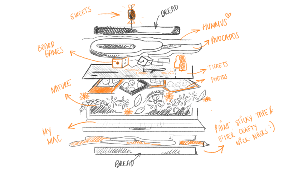 - Spend 5 minutes building up your sandwich. It can contain anything you like – from real food to house objects – anything that describes your personality. The sandwich should be visual, therefore you will need to draw, but you can add words on a side or make a scheme as well.