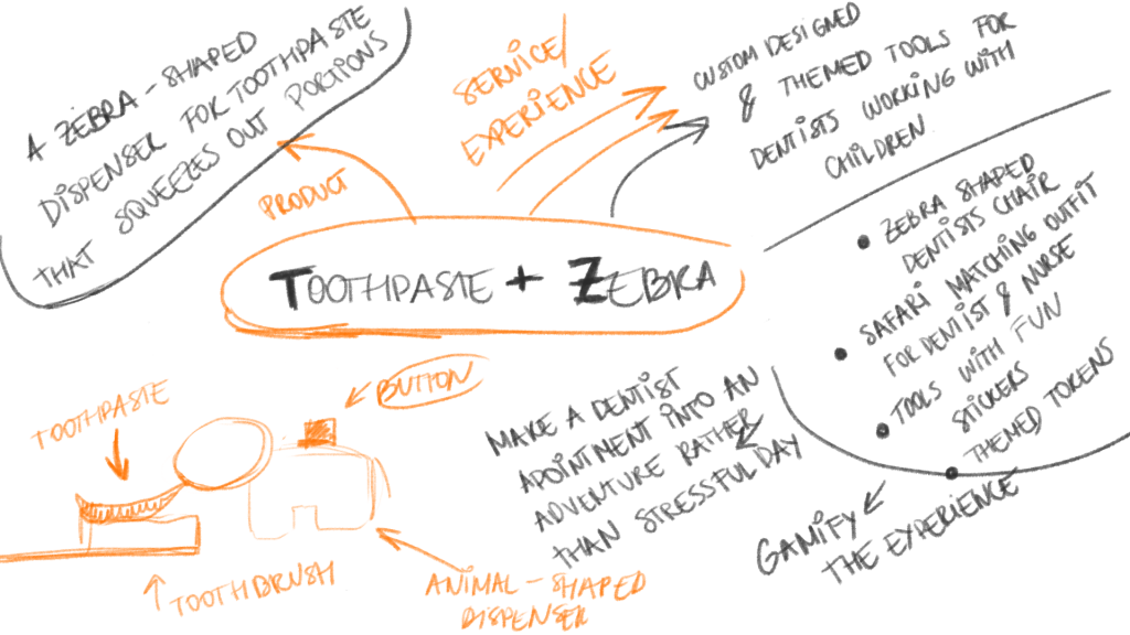- Now, combine your object with your neighbors object to create a business opportunity: a product or a service. Ex. Toothpaste + Zebra = a zebra shaped toothpaste dispenser for kids that squeezes out portions (a product); custom designed and themed tools for dentists working with children (service/experience). Think about the concept in detail – what purpose does it serve, who uses it, how does it look like, etc.