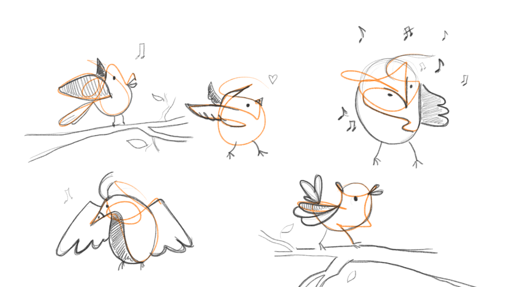 - Now, start turning squiggles into birds. Think what are the main characteristics of a bird (beak, tale, legs) and start adding them. First, draw a beak which is a simple triangle – make variations in size and position. Then, do the same with tale, which is also a triangle. Finally, add legs that are made out of sticks. That is how simple it is!